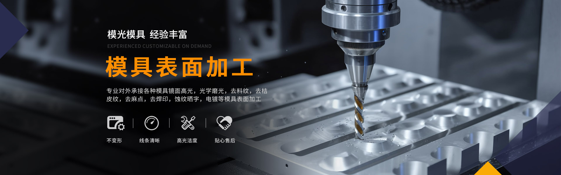 東莞模光模具科技有限公司是一家專業對外承接各種模具鏡面高光,光學磨光,去料紋,去桔皮紋,去麻點,去焊印,蝕紋曬字,電鍍等模具表面加工。